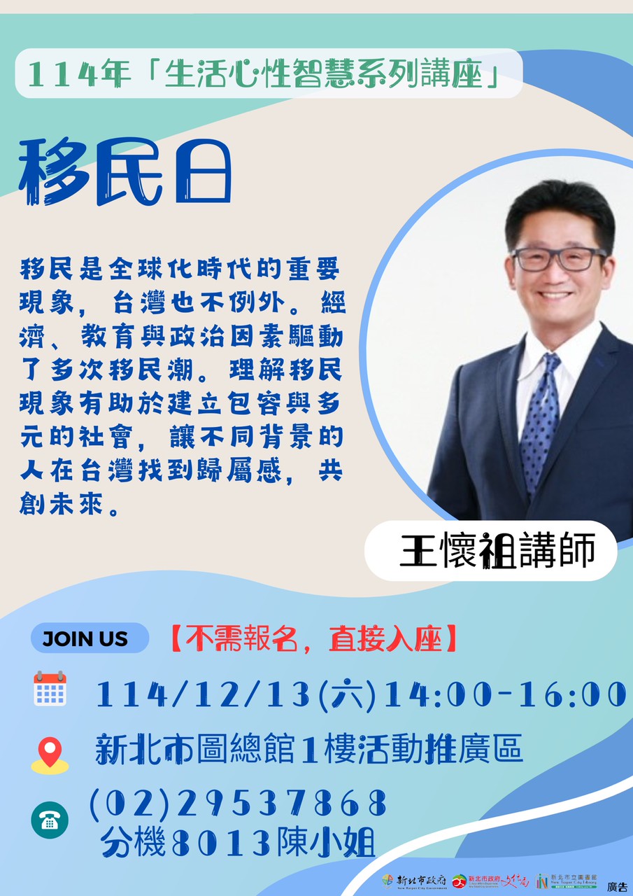 大綱簡介:移民是全球化時代的重要現象,台灣也不例外。經濟、教育與政治因素驅動了多次移民潮。